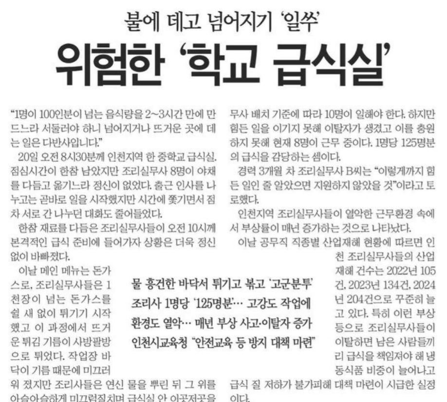 <°æ±âÀϺ¸>´Â 21ÀÏ 7¸é <ºÒ¿¡ µ¥°í ³Ñ¾îÁö±â ÀϾ¥ÀÎ À§ÇèÇÑ ¡®Çб³ ±Þ½Ä½Ç¡¯> ±â»ç¿¡¼ ¡°¹° Èï°ÇÇÑ ¹Ù´Ú¼ Æ¢±â°í ºº°í ¡®°í±ººÐÅõ¡¯, Á¶¸®»ç 1¸í´ç ¡®125¸íºÐ¡¯¡¦ °í°µµ ÀÛ¾÷¿¡ ȯ°æµµ ¿¾Ç¡¦ ¸Å³â ºÎ»ó »ç°í¡¤ÀÌÅ»ÀÚ Áõ°¡, °ø¹«Á÷ Á÷Á¾º° »ê¾÷ÀçÇØ ÇöȲ¿¡ µû¸£¸é ÀÎõ Á¶¸®½Ç¹«»çµéÀÇ »ê¾÷ÀçÇØ °Ç¼ö´Â 2022³â 105°Ç, 2023³â 134°Ç, 2024³â 204°ÇÀ¸·Î ²ÙÁØÈ÷ ´Ã°í ÀÖ´Ù.¡±¶ó°í Çб³ ±Þ½Ä½Ç ³ëµ¿ÀÚÀÇ ¿¾ÇÇÑ ³ëµ¿ ȯ°æÀ» º¸µµÇß´Ù. |