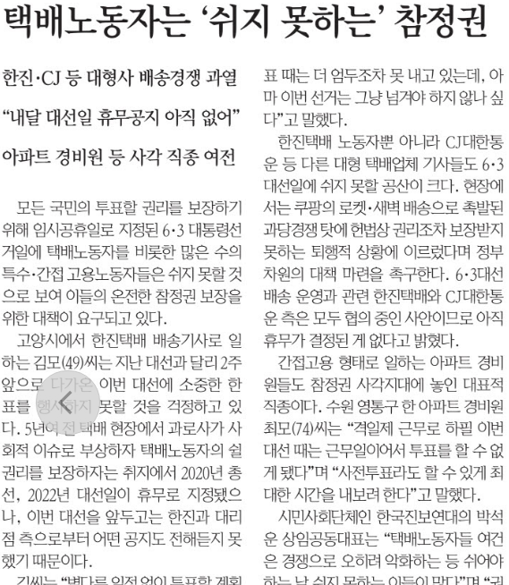 <°æÀÎÀϺ¸>´Â 20ÀÏ 7¸é <ÅÃ¹è ³ëµ¿ÀÚ´Â ¡®½¬Áö ¸øÇϴ¡¯ ÂüÁ¤±Ç> ±â»ç¿¡¼ ¡°¸ðµç ±¹¹ÎÀÇ ÅõÇ¥ÇÒ ±Ç¸®¸¦ º¸ÀåÇϱâ À§ÇØ ÀӽðøÈÞÀÏ·Î ÁöÁ¤µÈ 6¡¤3 ´ëÅë·É¼±°ÅÀÏ¿¡ ÅÃ¹è ³ëµ¿ÀÚ¸¦ ºñ·ÔÇÑ ¸¹Àº ¼öÀÇ Æ¯¼ö¡¤°£Á¢ °í¿ë ³ëµ¿ÀÚµéÀº ½¬Áö ¸øÇÒ °ÍÀ¸·Î º¸¿© À̵éÀÇ ¿ÂÀüÇÑ ÂüÁ¤±Ç º¸ÀåÀ» À§ÇÑ ´ëÃ¥ÀÌ ¿ä±¸µÇ°í ÀÖ´Ù.¡¦ÇÑÁøÅÃ¹è ³ëµ¿ÀÚ»Ó ¾Æ´Ï¶ó CJ´ëÇÑÅë¿î µî ´Ù¸¥ ´ëÇü Åùè¾÷ü ±â»çµéµµ 6¡¤3´ë¼±ÀÏ¿¡ ½¬Áö ¸øÇÒ °ø»êÀÌ Å©´Ù. ÇöÀå¿¡¼´Â ÄíÆÎÀÇ ·ÎÄÏ¡¤»õº® ¹è¼ÛÀ¸·Î ÃË¹ßµÈ °ú´ç°æÀï Å¿¿¡ Çå¹ý»ó ±Ç¸®Á¶Â÷ º¸Àå¹ÞÁö ¸øÇÏ´Â ÅðÇàÀû »óȲ¿¡ À̸£·¶´Ù¸ç Á¤ºÎ Â÷¿øÀÇ ´ëÃ¥ ¸¶·ÃÀ» Ã˱¸ÇÑ´Ù.¡±¶ó°í ÅÃ¹è ³ëµ¿ÀÚ¿Í ¾ÆÆÄÆ® °æºñ¿ø µî ÂüÁ¤±ÇÀ» º¸Àå¹ÞÁö ¸øÇÏ´Â À̵éÀÇ Çö½ÇÀ» º¸µµ, °ø·ÐÈÇÏ¿© À̵éÀÇ ÂüÁ¤±ÇÀ» ´©¸± ¼ö ÀÖ´Â ±â»ç¸¦ º¸µµÇß´Ù. |