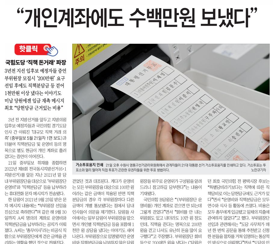 <ÁߺÎÀϺ¸>´Â 21ÀÏ 1¸é <±¹Èû ¡®Áö¹æ¼±°Å ³ú°ü¡¯ ÅÍÁö³ª> ±â»ç¿¡¼ ¡°°æ±âµµ´ç ºÎÀ§¿øÀåÁ÷ 200¸¸¿ø, 3³â Àü ºÎÀ§¿øÀåÀÌ ¹®ÀÚ¸Þ½ÃÁö º¸³»°í ½ÇÁ¦ µ· ¹Þ°í 100¿© ¸í¿¡ ÀÓ¸íÀåÀ» ÁÖ¾úÀ¸¸ç Àμ±ÀÚ »ó´ç¼ö Áö¼± °øÃµ ½ÅûÇß´Ù¡±, 22ÀÏ 1¸é <°³ÀÎ °èÁ¿¡µµ ¼ö ¹é¸¸¿ø º¸³Â´Ù> ±â»ç¿¡¼ ¡°3³âÀü Áö¼± ÀÔÈĺ¸ ¿¹Á¤ÀÚµé Áõ¾ð, ºÎÀ§¿øÀå ¸ðÁý½Ã ¡®200¸¸¿ø¡¯ ¿ä±¸Çß°í ¼±ÀÓ ÈÄ¿¡µµ Á÷Ã¥ ºÐ´ã±Ý µî °È¾úÀ¸¸ç 1õ¸¸¿ø ÀÌ»ó ³Â´Ù´Â À̾߱⵵ ÀÖ°í ¹Ì³³ ´ç¿ø¿¡°Õ ÀÔ±Ý ÀçÃË ¸Þ½ÃÁö¡±, 23ÀÏ 2¸é <¡®Á÷Ã¥ µ¿°Å·¡¡¯ ÀÇȤ ±× ÈÄ> ±â»ç¿¡¼ ¡°ÀÔ±Ý ´ë°¡·Î °øÃµ½É»ç ¿ì´ë ¹ÞÀº µí, ´ç ¾ÈÆÆ Á÷Ã¥ ÀÌ¿ë ´ç¶ô ¿µÇâ ÇØ¼®, µµ ¼±°üÀ§, º»º¸ º¸µµ ÈÄ È®ÀÎ ³ª¼ ¡°ÀÇȤ ÀÎÁö¡¦ °ü·Ã¹ý À§¹Ý ¿©ºÎ °ËÅ䡱, ¸ð¸¥´Ù´ø ±è¼º¿ø ÀÇ¿ø, ´ÜÅ广 Âü¿©, ¡®±¹Èû µµ´ç ºÎÀ§¿øÀ塯 °æ·Â ±âÀç 47¸í Áß 36¸í ´ç¼±¡°µÆ´Ù°í ´Üµ¶ º¸µµÇß´Ù. |