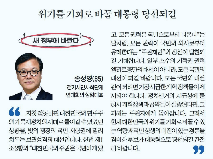 20ÀÏ 1¸é <¼Û¼º¿µ °æ±â½Ã¹Î´Üü¿¬´ëȸÀÇ »óÀÓ´ëÇ¥ - À§±â¸¦ ±âȸ·Î ¹Ù²Ü ´ëÅë·É ´ç¼±µÇ±æ>