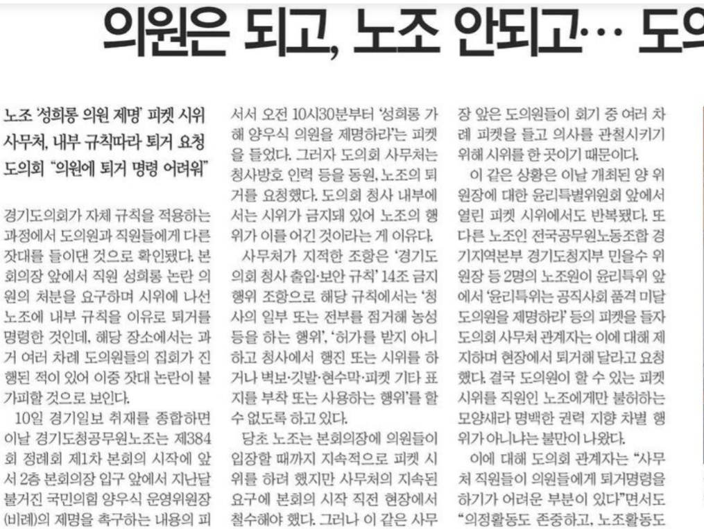 <°æ±âÀϺ¸>´Â 11ÀÏ 5¸é <ÀÇ¿øÀº µÇ°í, ³ëÁ¶ ¾ÈµÇ°í¡¦µµÀÇȸ û»ç ½ÃÀ§ ¡®ÀÌÁßÀã´ë¡¯ ³í¶õ> ±â»ç¿¡¼ ¡°»ç¹«Ã³°¡ ÁöÀûÇÑ Á¶Ç×Àº ¡®°æ±âµµÀÇȸ û»ç ÃâÀÔ¡¤º¸¾È ±ÔÄ¢¡¯ 14Á¶ ±ÝÁöÇàÀ§ Á¶Ç×À¸·Î ÇØ´ç ±ÔÄ¢¿¡¼´Â ¡®Ã»»çÀÇ ÀϺΠ¶Ç´Â ÀüºÎ¸¦ Á¡°ÅÇØ ³ó¼º µîÀ» ÇÏ´Â ÇàÀ§¡¯, ¡®Çã°¡¸¦ ¹ÞÁö ¾Æ´ÏÇϰí û»ç¿¡¼ ÇàÁø ¶Ç´Â ½ÃÀ§¸¦ Çϰųª º®º¸¡¤±ê¹ß¡¤Çö¼ö¸·¡¤ÇÇÄÏ ±âŸ Ç¥Áö¸¦ ºÎÂø ¶Ç´Â »ç¿ëÇÏ´Â ÇàÀ§¡¯¸¦ ÇÒ ¼ö ¾øµµ·Ï Çϰí ÀÖ´Ù.¡±¶ó°í »ç¹«Ã³ÀÇ ÀÔÀåÀ» ÀοëÇÏ°í ¡°°æ±âµµÀÇȸ°¡ ÀÚü ±ÔÄ¢À» Àû¿ëÇÏ´Â °úÁ¤¿¡¼ µµÀÇ¿ø°ú Á÷¿øµé¿¡°Ô ´Ù¸¥ Àã´ë¸¦ µéÀÌ´í °ÍÀ¸·Î È®ÀεƴÙ. º»È¸ÀÇÀå ¾Õ¿¡¼ Á÷¿ø ¼ºÈñ·Õ ³í¶õ ÀÇ¿øÀÇ Ã³ºÐÀ» ¿ä±¸ÇÏ¸ç ½ÃÀ§¿¡ ³ª¼± ³ëÁ¶¿¡ ³»ºÎ ±ÔÄ¢À» ÀÌÀ¯·Î Åð°Å¸¦ ¸í·ÉÇÑ °ÍÀε¥, ÇØ´ç Àå¼Ò¿¡¼´Â °ú°Å ¿©·¯ Â÷·Ê µµÀÇ¿øµéÀÇ Áýȸ°¡ ÁøÇàµÈ ÀûÀÌ ÀÖ¾î ÀÌÁß Àã´ë ³í¶õÀÌ ºÒ°¡ÇÇÇÒ °ÍÀ¸·Î º¸ÀδÙ.¡±¶ó°í µµÀÇȸ¿¡¼ ÇÇÄÏ ½ÃÀ§¸¦ Çϴµ¥ µµÀÇ¿øÀº °¡´ÉÇߴµ¥ ³ëÁ¶¿¡°Ô´Â Çã°¡µÇÁö ¾Ê¾Æ ÀÌÁßÀã´ë¶ó°í º¸µµÇß´Ù. |