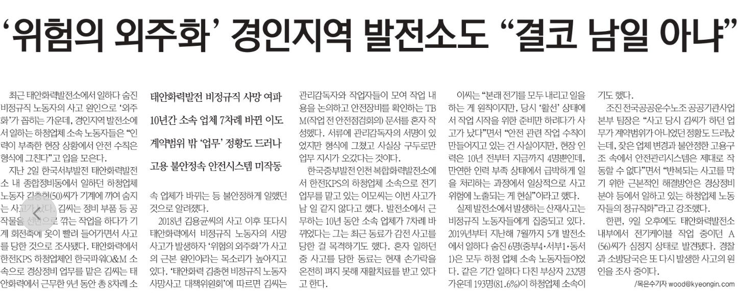 <°æÀÎÀϺ¸>´Â 10ÀÏ 7¸é <¡®À§ÇèÀÇ ¿ÜÁÖÈ¡¯ °æÀÎ Áö¿ª ¹ßÀü¼Òµµ ¡°°áÄÚ ³²ÀÏ ¾Æ³Ä¡±> ±â»ç¿¡¼ ¡°Ãֱ٠žÈȷ¹ßÀü¼Ò¿¡¼ ÀÏÇÏ´Ù ¼ûÁø ºñÁ¤±ÔÁ÷ ³ëµ¿ÀÚÀÇ »ç°í ¿øÀÎÀ¸·Î ¡®¿ÜÁÖÈ¡¯°¡ ²ÅÈ÷´Â °¡¿îµ¥, °æÀÎÁö¿ª ¹ßÀü¼Ò¿¡¼ ÀÏÇÏ´Â ÇÏû¾÷ü ¼Ò¼Ó ³ëµ¿ÀÚµéÀº ¡°ÀηÂÀÌ ºÎÁ·ÇÑ ÇöÀå »óȲ¿¡¼ ¾ÈÀü ¼öÄ¢Àº Çü½Ä¿¡ ±×Ä£´Ù¡±°í ÀÔÀ» ¸ðÀº´Ù.¡¦½ÇÁ¦ ¹ßÀü¼Ò¿¡¼ ¹ß»ýÇÏ´Â »êÀç»ç°í´Â ºñÁ¤±ÔÁ÷ ³ëµ¿Àڵ鿡°Ô ÁýÁߵǰí ÀÖ´Ù. 2019³âºÎÅÍ Áö³ÇØ 7¿ù±îÁö 5°³ ¹ßÀü¼Ò¿¡¼ ÀÏÇÏ´Ù ¼ûÁø 6¸í(ÁߺÎ4¡¤¼ºÎ1¡¤µ¿¼1)Àº ¸ðµÎ ÇÏû ¾÷ü ¼Ò¼Ó ³ëµ¿ÀÚµéÀ̾ú´Ù. Á¶Áø Àü±¹°ø°ø¿î¼ö³ëÁ¶ °ø°ø±â°ü»ç¾÷º»ºÎ ÆÀÀåÀº ¡°¹Ýº¹µÇ´Â »ç°í¸¦ ¸·±â À§ÇÑ ±Ùº»ÀûÀÎ ÇØ°á¹æ¾ÈÀº °æ»óÁ¤ºñ ºÐ¾ß µî¿¡¼ ÀÏÇϰí ÀÖ´Â ÇÏû¾÷ü ³ëµ¿ÀÚµéÀÇ Á¤±ÔÁ÷È¡±¶ó°í °Á¶Çß´Ù.¡±¶ó¸ç ¼ûÁø ³ëµ¿ÀÚµéÀÇ ´ëºÎºÐÀÌ ÇÏû¾÷ÀÚ, Áï À§ÇèÀÇ ¿ÜÁÖÈ·Î ½ÃÀÛµÈ °ÍÀÓÀ» ÁöÀûÇÏ°í ¹Ýº¹µÇ´Â »ç°í¸¦ ¸·±â À§ÇØ ³ëµ¿ÀÚµéÀÇ Á¤±ÔÁ÷ÈÀÇ Çʿ伺À» ³ëµ¿Á¶ÇÕ °ü°èÀÚÀÇ ¸»À» ÀÎ¿ë º¸µµÇß´Ù. |