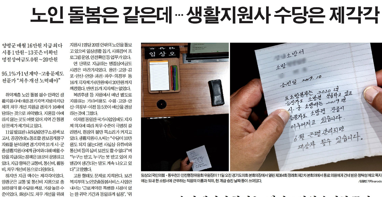 <ÀÎõÀϺ¸>´Â 12ÀÏ 1¸é <³ëÀÎ µ¹º½Àº °°Àºµ¥¡¦»ýȰ Áö¿ø»ç ¼ö´çÀº Á¦°¢°¢> ±â»ç¿¡¼ ¡°¾çÆò±ºÀº ±³Åë ¹× Åë½Åºñ Áö¿øÀ¸·Î ÃÑ 16¸¸¿øÀÇ ¿ù ¼ö´çÀ» Ã¥Á¤, °¡Àå ³ôÀº ¼öÁØÀ̾ú´Ù. ȼº½Ãµµ ó¿ì °³¼±À» À§ÇØ 12¸¸¿øÀ» Áö±ÞÇß´Ù. °í¾ç¡¤ÀÌõ¡¤ºÎõ¡¤±èÆ÷ µîÀº 10¸¸¿øÀÌ´Ù. ÀÌ¾î ¿¬Ãµ 9¸¸¿ø, °¡Æò 8¸¸¿ø, ¿ëÀΡ¤ÀÇÁ¤ºÎ¡¤³²¾çÁÖ¡¤±¤¸í¡¤¿©ÁÖ µî 5¸¸¿ø ¼øÀÌ´Ù. ¿À»ê°ú ½ÃÈïÀº °¢°¢ 1¸¸5000¿ø, 1¸¸¿øÀ¸·Î ³ªÅ¸³µ´Ù. ÁöÀÚüÀÇ Ãִ롤ÃÖ¼Ò ¼ö´ç ¾×¼ö°¡ 16¹è ¹ú¾îÁö´Â ¼ÀÀÌ´Ù. 13°÷ ÁöÀÚüÀÇ °æ¿ì, ¿ù ¼ö´ç ±âÁØÀ» µÎÁö ¾Ê°Å³ª Áö±Þ ¿©ºÎ ÀÚü°¡ È®ÀεÇÁö ¾Ê¾Ò´Ù.¡¦±¸º»½Â ³ª¶ó»ì¸²¿¬±¸¼Ò Ã¥ÀÓ¿¬±¸¿øÀº ¡°º¹ÁöºÎ¿Í ÁöÀÚü, Áö¹æÀÇȸ´Â »ýȰÁö¿ø»ç¸¦ Æ÷ÇÔÇÑ µ¹º½ ³ëµ¿ÀÚÀÇ Ã³¿ì °³¼±À» À§ÇØ ´ç»çÀÚ Àǰ߼ö·Å°ú Çö¾È ÀïÁ¡ ½ÇÅÂÁ¶»ç, Á¶·ÊÁ¦Á¤ µî¿¡ ³ë·ÂÇØ¾ß ÇÑ´Ù¡±°í ¹àÇû´Ù.¡±¶ó°í ³ëÀÎ µ¹º½ ÀηÂÀÎ »ýȰ Áö¿ø»ç¿¡ ´ëÇÑ Áö¿øÀÌ Áö¹æÀÚÄ¡´Üüº°·Î Å©°Ô´Â 16¹èÀÇ Â÷À̰¡ ³ª°í ¿ù ¼ö´çÀÌ ¾ø´Â °÷µµ ÀÖ¾î, µ¹º½ ³ëµ¿ÀÚÀÇ Ã³¿ì °³¼±ÀÌ ÇÊ¿äÇÏ´Ù°í º¸µµÇß´Ù. |