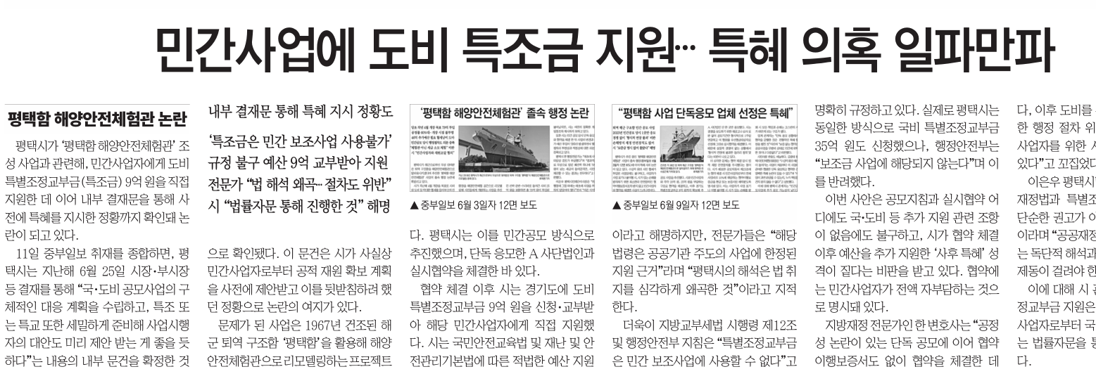 <ÁߺÎÀϺ¸>´Â 11ÀÏ 12¸é <ÆòÅÃÇ× ÇØ¾ç¾ÈÀüüÇè°ü ³í¶õ> ±â»ç¿¡¼ ¡°ÆòÅýð¡ ¡®ÆòÅÃÇÔ ÇØ¾ç¾ÈÀüüÇè°ü¡¯ Á¶¼º »ç¾÷°ú °ü·Ã(ÁߺÎÀϺ¸ 6¿ù 3ÀÏÀÚ, 9ÀÏÀÚ 12¸é º¸µµ)ÇØ, ¹Î°£»ç¾÷ÀÚ¿¡°Ô µµºñ Ưº°Á¶Á¤±³ºÎ±Ý(ƯÁ¶±Ý) 9¾ï ¿øÀ» Á÷Á¢ Áö¿øÇÑ µ¥ ÀÌ¾î ³»ºÎ °áÀç¹®À» ÅëÇØ »çÀü¿¡ ƯÇý¸¦ Áö½ÃÇÑ Á¤È²±îÁö È®ÀεŠ³í¶õÀÌ µÇ°í ÀÖ´Ù.¡±¡¦Áö¹æ±³ºÎ¼¼¹ý ½ÃÇà·É Á¦12Á¶ ¹× ÇàÁ¤¾ÈÀüºÎ ÁöħÀº ¡°Æ¯º°Á¶Á¤±³ºÎ±ÝÀº ¹Î°£ º¸Á¶»ç¾÷¿¡ »ç¿ëÇÒ ¼ö ¾ø´Ù"°í ¸íÈ®È÷ ±ÔÁ¤Çϰí ÀÖ´Ù. ½ÇÁ¦·Î ÆòÅýô µ¿ÀÏÇÑ ¹æ½ÄÀ¸·Î ±¹ºñ Ưº°Á¶Á¤±³ºÎ±Ý 35¾ï ¿øµµ ½ÅûÇßÀ¸³ª, ÇàÁ¤¾ÈÀüºÎ´Â º¸Á¶±Ý »ç¾÷¿¡ ÇØ´çµÇÁö ¾Ê´Â´Ù¸ç À̸¦ ¹Ý·ÁÇß´Ù.¡±¡¦Áö¹æÀçÁ¤ Àü¹®°¡ÀÎ ÇÑ º¯È£»ç´Â ¡°°øÁ¤¼º ³í¶õÀÌ ÀÖ´Â ´Üµ¶ °ø¸ð¿¡ À̾î Çù¾àÀÌÇຸÁõ¼µµ ¾øÀÌ Çù¾àÀ» ü°áÇÑ µ¥´Ù, ÀÌÈÄ µµºñ¸¦ Ãß°¡ Áö¿øÇÑ °ÍÀº ¸í¹éÇÑ ÇàÁ¤ ÀýÂ÷ À§¹Ý¡±À̶ó¸ç ¡°À̴ ƯÁ¤ »ç¾÷ÀÚ¸¦ À§ÇÑ »ç½Ç»óÀÇ Æ¯Çý·Î º¼ ¼ö ÀÖ´Ù¡±¶ó°í ÆòÅýÿ¡¼ ¡®ÆòÅÃÇ× ÇØ¾ç¾ÈÀüüÇè°ü¡¯ Á¶¼º »ç¾÷¿¡ Ưº° Á¶Á¤ ±³ºÎ±ÝÀ» Áö±Þ ÇÏ´Â µî ƯÇý ³í¶õÀÌ ÀÖ´Ù°í º¸µµÇß´Ù. |