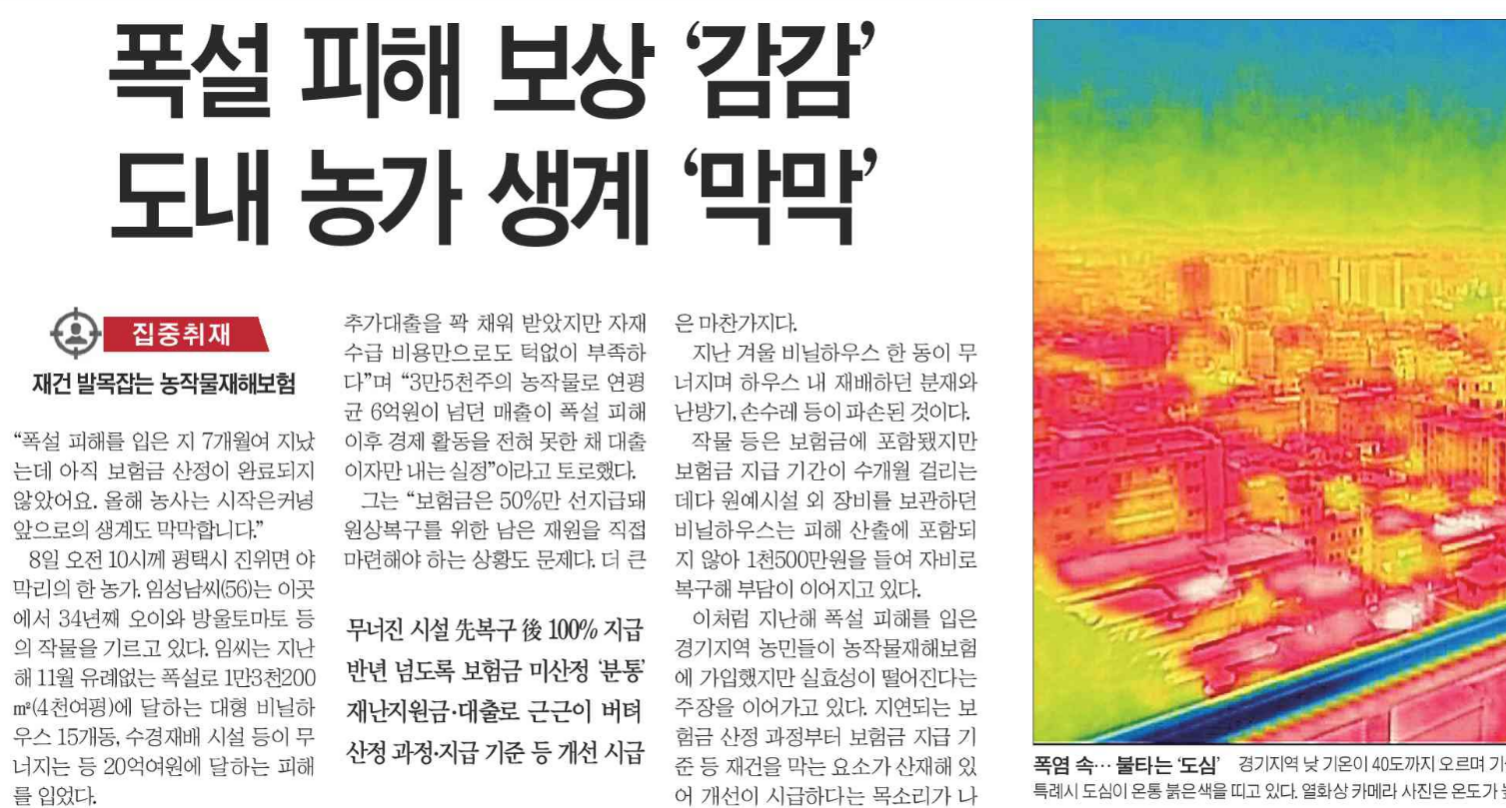 <°æ±âÀϺ¸>´Â 9ÀÏ 1¸é <ÁýÁßÃëÀç-Àç°Ç ¹ß¸ñ Àâ´Â ³óÀÛ¹° ÀçÇØº¸Çè> ±â»ç¿¡¼ ¡°ÀÌ·² °Å¸é º¸Çè ¾È µé¾úÁÒ¡±¶ó´Â ºÎÁ¦¸ñ°ú ÆòÅýÃ, ȼº Ư·Ê½Ã ³ó¹ÎµéÀÇ »ç·Ê¸¦ º¸µµÇÏ¸ç ¡°¹«³ÊÁø ½Ã¼³ ໺¹±¸ ý 100% Áö±Þ¡¦¹Ý³â ³Ñµµ·Ï º¸Çè±Ý ¹Ì»êÁ¤À¸·Î ºÐÅëÀÌ ÅÍÁö°í Àç³Áö¿ø±Ý°ú ´ëÃâ·Î ±Ù±ÙÀÌ ¹öƼ°í ÀÖ¾î »êÁ¤ °úÁ¤°ú ±âÁØ µî °³¼±ÀÌ ½Ã±ÞÇÏ´Ù.¡±¶ó°í º¸µµÇß´Ù.