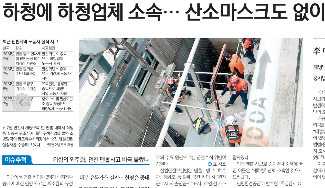 <°æÀÎÀϺ¸>´Â 8ÀÏ 6¸é <À̽´ ÃßÀû-À§ÇèÀÇ ¿ÜÁÖÈ, ÀÎõ ¸ÇȦ »ç°í ºñ±Ø ºÒ·¶³ª> ±â»ç¿¡¼ ¡°ÀÎõ¿¡¼ ¸ÇȦ ÀÛ¾÷ÀÚ 2¸íÀÌ ¼ûÁö°Å³ª ÁßÅ¿¡ ºüÁø ÀÎ¸í »ç°í´Â ÃÖ¼ÒÇÑÀÇ ±ÔÁ¤Á¶Â÷ ¾î±ä ¡®À§ÇèÀÇ ¿ÜÁÖÈ¡¯°¡ ºÎ¸¥ ÀÎÀç(ìÑî¬)·Î º¸´Â ½Ã°¢ÀÌ ÀûÁö ¾Ê´Ù.¡¦»ê¾÷¾ÈÀüº¸°Ç¹ýÀº ¸ÇȦ, ÅÊÅ©, Çϼö°ü, Á¤ÈÁ¶ µî ¹ÐÆó °ø°£ ÀÛ¾÷ ½Ã ¡®°ü°è ±Ù·ÎÀÚ ¿Ü ÃâÀÔ ±ÝÁö¡¯ Ç¥½Ã, ÀÛ¾÷ Àü °¡½º ³óµµ ÃøÁ¤, ȯ±â, º¸È£±¸ Áö±Þ µîÀ» ½Ç½ÃÇϵµ·Ï ±ÔÁ¤Çϰí ÀÖ´Ù.¡¦ÀÎõȯ°æ°ø´ÜÀÌ ¹ßÁÖÇÑ ¡®Â÷Áý°ü·Î GIS(Áö¸®Á¤º¸½Ã½ºÅÛ) DB(µ¥ÀÌÅͺ£À̽º) ±¸Ã࡯ ¿ë¿ªÀ» ¼öÁÖÇÑ A¾÷ü´Â B¾÷ü¿Í Çϵµ±Þ °è¾àÀ» ¸Î¾ú´Ù. »ç°í°¡ ³ ³ëµ¿ÀÚµéÀº B¾÷ü¿Í ¶Ç´Ù½Ã Çϵµ±Þ °è¾àÀ» ¸ÎÀº C¾÷ü ¼Ò¼ÓÀÌ´Ù.