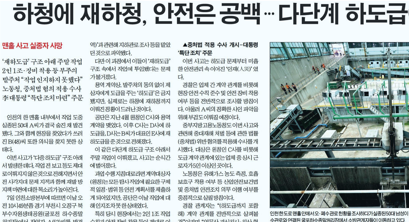 9ÀÏ 7¸é <¸ÇȦ »ç°í ½ÇÁ¾ÀÚ »ç¸Á - ±ô±ôÀÌ Çϵµ±ÞÀÌ ºÎ¸¥ ¡®ÀÎÀ硯¡¦¹ßÁÖó Ã¥Àӷеµ ºÒºÙ¾î> ±â»ç¿¡¼ ¡°ÀÎõ ÇÑ ¸ÇȦ ¾È¿¡¼ ÀÛ¾÷À» ¹úÀÌ´ø 50´ë ³²¼ºÀÌ ¼ûÁö°í, 40´ë ³²¼ºÀÌ ÁßÅ¿¡ ºüÁø »ç°í´Â °ü·Ã ¾÷ü¸¸ 4°³¿¡ À̸£´Â ´ÙÁß Çϵµ±Þ ±¸Á¶, ±×¸®°í ÀÌ¿¡ µû¸¥ ¾ÈÀü °ü¸® »ç°¢Áö´ë ¼Ó¿¡¼ ¹ú¾îÁø 'ÀÎÀç(ìÑî¬)'·Î µå·¯³µ´Ù.¡¦³ëµ¿°è¿¡¼´Â »ç°í Àç¹ß ¹æÁöÀ» ¸·±â À§Çؼ´Â µµ±ÞÀÎÀÇ Ã¥ÀÓÀ» º¸´Ù °ÈÇÏ´Â Á¦µµÀû º¸¿ÏÀÌ ÇÊ¿äÇÏ´Ù´Â ¸ñ¼Ò¸®°¡ ³ª¿Â´Ù. ´Ü¼øÈ÷ 'Çϵµ±Þ ±ÝÁö' Á¶Ç×À» °ú¾÷ Áö½Ã¼ »ó¿¡ ¸í½ÃÇß´Ù´Â °Í¸¸À¸·Î, µµ±ÞÀÎÀÌ Ã¥ÀÓÀ» ȸÇÇÇØ¼´Â ¾È µÈ´Ù´Â ÃëÁö´Ù.¡±¶ó°í ÀçÇÏûÀÇ ¹®Á¦¸¦ ÁöÀûÇϰí Á¦µµÀû º¸¿ÏÀÇ Çʿ伺À» º¸µµÇß´Ù.