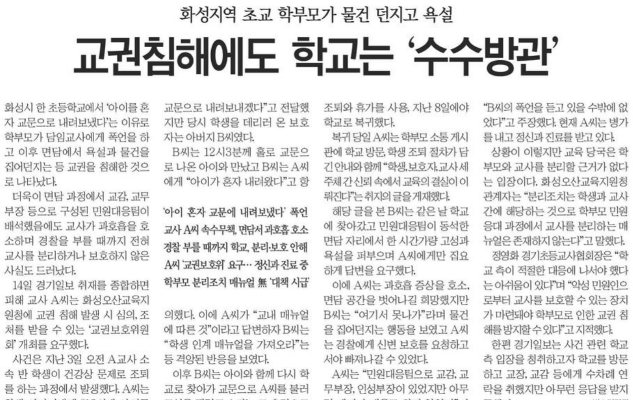 ȼº½Ã ÇÑ ÃʵîÇб³¿¡¼ ¡®¾ÆÀ̸¦ È¥ÀÚ ±³¹®À¸·Î ³»·Áº¸³Â´Ù¡¯´Â ÀÌÀ¯·Î Çкθ𰡠´ãÀÓ ±³»ç¿¡°Ô Æø¾ð°ú ¿å¼³À» Çϰí, ÀÌÈÄ ¸é´ã¿¡¼ ¹°°ÇÀ» Áý¾î ´øÁö´Â µî ±³±ÇÀ» Ä§ÇØÇÑ °ÍÀ¸·Î ³ªÅ¸³µ´Ù. ´õ¿íÀÌ ¸é´ã °úÁ¤¿¡¼ ±³°¨, ±³¹«ºÎÀå µîÀ¸·Î ±¸¼ºµÈ ¹Î¿ø´ëÀÀÆÀÀÌ ¹è¼®ÇßÀ½¿¡µµ ±³»ç°¡ °úÈ£ÈíÀ» È£¼ÒÇÏ¸ç °æÂûÀ» ºÎ¸¦ ¶§±îÁö ÀüÇô ±³»ç¸¦ ºÐ¸®Çϰųª º¸È£ÇÏÁö ¾ÊÀº »ç½Çµµ µå·¯³µ´Ù.