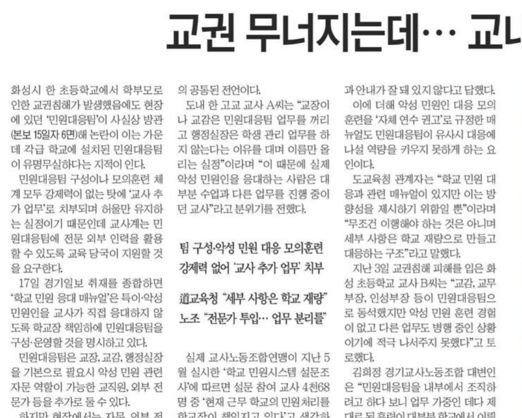 18ÀÏ 5¸é <±³±Ç ¹«³ÊÁö´Âµ¥¡¦±³³» ¹Î¿ø ´ëÀÀÆÀ ¡®Çã¿ï»Ó¡¯> ±â»ç¿¡¼ ¡°¹Î¿ø´ëÀÀÆÀ ±¸¼ºÀ̳ª ¸ðÀÇ ÈÆ·Ã ü°è ¸ðµÎ °Á¦·ÂÀÌ ¾ø´Â Å¿¿¡ ¡®±³»ç Ãß°¡ ¾÷¹«¡¯·Î Ä¡ºÎµÇ¸ç Çã¿ï¸¸ À¯ÁöÇÏ´Â ½ÇÁ¤À̱⠶§¹®Àε¥, ±³»ç°è´Â ¹Î¿ø ´ëÀÀÆÀ¿¡ Àü¹® ¿ÜºÎ ÀηÂÀ» Ȱ¿ëÇÒ ¼ö ÀÖµµ·Ï ±³À° ´ç±¹ÀÌ Áö¿øÇÒ °ÍÀ» ¿ä±¸ÇÑ´Ù.¡±¶ó¸ç ±³±Ç ¹Î¿ø ´ëÀÀÆÀÀÇ Á¦µµÀû ¹®Á¦¸¦ º¸µµÇß´Ù. |