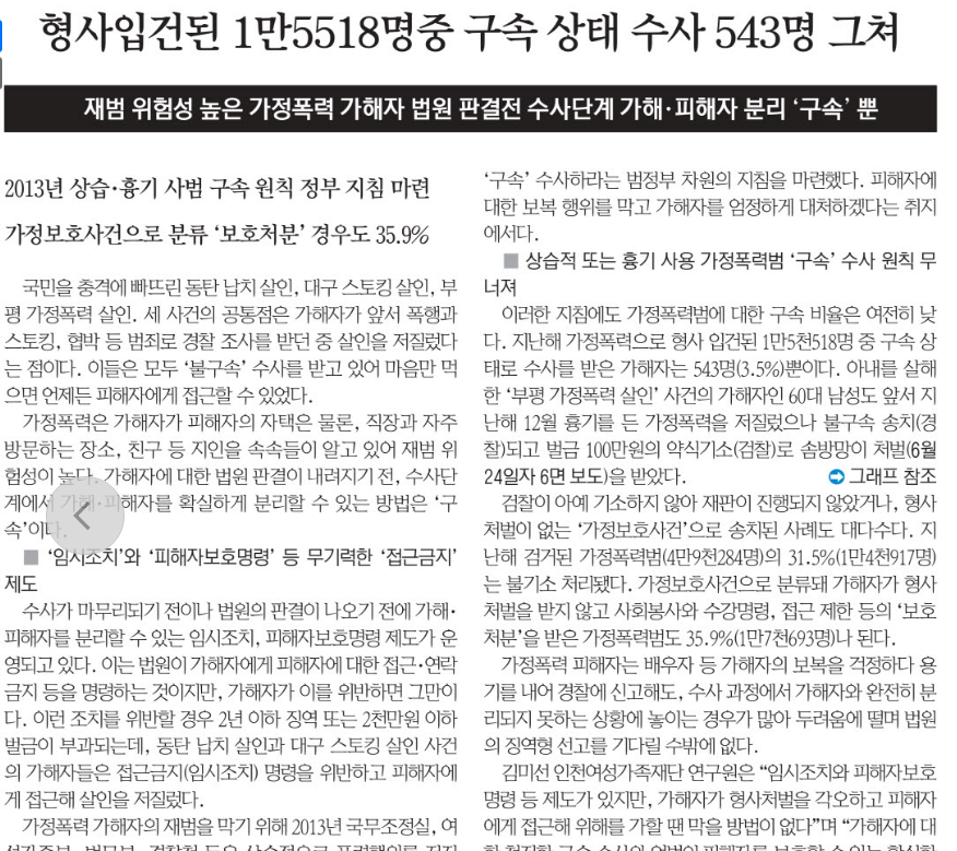 <°æÀÎÀϺ¸>´Â 14ÀÏ 1¸é <°¡Á¤Æø·Â »ìÀÎ, ¹Ýº¹µÈ ½Ã±×³Î »ó. - ÆøÇ൵ ¿ë¼µÇ´Â °øÆ÷ÀÇ Áý> ±â»ç¿¡¼ ¡°¡®¹ÝÀÇ»çºÒ¹ú¡¯ Á¶Ç×±Ù°Å·Î ¼ö»ç Á¾°áµÇ´Â °æ¿ì°¡ ¸¹°í ÇÏ·ç 492°Ç ½Å°í 462°Ç ¡®¾ø´ø ÀÏ¡¯·Î µÇ¸ç Á¤½Ä »ç°Ç Á¢¼ö ¶© °¡Á¤ ÆÄź °ÆÁ¤, 47.3%, ¹è¿ìÀÚ Æø·Â ½É°¢ÇÏÁö¾Ê´Ù¡±°í »ý°¢Çϰí ÀÖ¾î °¡Á¤ Æø·ÂÀÇ ½É°¢¼ºÀ» º¸µµÇß´Ù. |