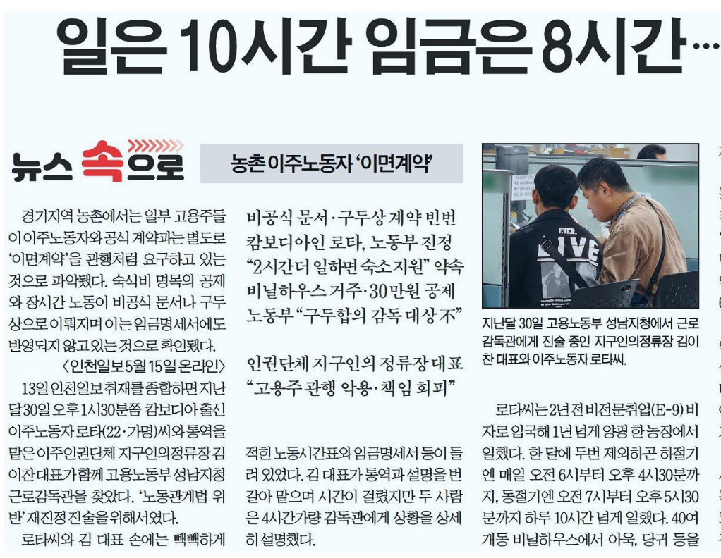 <ÀÎõÀϺ¸>´Â 14ÀÏ 1¸é <´º½º ¼ÓÀ¸·Î - ³óÃÌ ÀÌÁֳ뵿ÀÚ ¡®ÀÌ¸é °è¾à¡¯> ±â»ç¿¡¼ ¡° įº¸µð¾Æ Ãâ½Å ÀÌÁֳ뵿ÀÚ ·ÎŸ(22¡¤°¡¸í)¾¾´Â ÇÑ ´Þ¿¡ µÎ¹ø Á¦¿ÜÇϰï ÇÏÀý±â¿£ ¸ÅÀÏ ¿ÀÀü 6½ÃºÎÅÍ ¿ÀÈÄ 4½Ã30ºÐ±îÁö, µ¿Àý±â¿£ ¿ÀÀü 7½ÃºÎÅÍ ¿ÀÈÄ 5½Ã30ºÐ±îÁö ÇÏ·ç 10½Ã°£ ³Ñ°Ô ÀÏÇߴµ¥ ½ÇÁ¦·Î ¹ÞÀº ÀÓ±ÝÀº ³ëµ¿ºÎ °è¾à¼¿¡ ¸í½ÃµÈ ¿ÀÀü 8½ÃºÎÅÍ ¿ÀÈÄ 5½Ã±îÁö, ÈްԽð£ 1½Ã°£À» Á¦¿ÜÇÑ ¡®8½Ã°£ ±âÁØ¡¯ ÃÖÀúÀӱݿ¡ ±×ÃÆ´Ù. 2023³â¿¡´Â ¸Å´Þ ¾à 215¸¸¿ø, 2024³â¿¡´Â ¾à 220¸¸¿ø °íÁ¤±Þ¸¸ ¹Þ¾Ò´Ù. ¸Å´Þ 55~65¸¸¿øÀÌ °øÁ¦µÈ ±Ý¾×À̾ú´Ù. ±â¼÷»çµµ °è¾à¼ ³»¿ë°ú ´Þ¶ú´Ù. °è¾à¼¿¡´Â ¡®ÁÖÅá® Á¦°øÀ¸·Î µÅ ÀÖ¾úÁö¸¸ ½ÇÁ¦ °ÅÁÖÁö´Â ³óÁö µÚÆí ºñ´ÒÇϿ콺¿´´Ù. ³Ã¡¤³¹æµµ »þ¿ö½Ã¼³µµ ºÎÁ·ÇÑ ±×°÷¿¡¼ ·ÎŸ¾¾¸¦ Æ÷ÇÔÇÑ 8¸í ÀÌÁֳ뵿ÀÚ°¡ °øµ¿»ýȰÀ» ÇØ¿Ô´Ù.¡±¶ó°í °üÇàÀûÀÎ ÀÌ¸é °è¾àÀ¸·Î ÀÌÁÖ ³ëµ¿ÀÚÀÇ ³ëµ¿±ÇÀ» Ä§ÇØÇϰí ÀÖ´Â Çö½ÇÀ» º¸µµÇß´Ù. |
