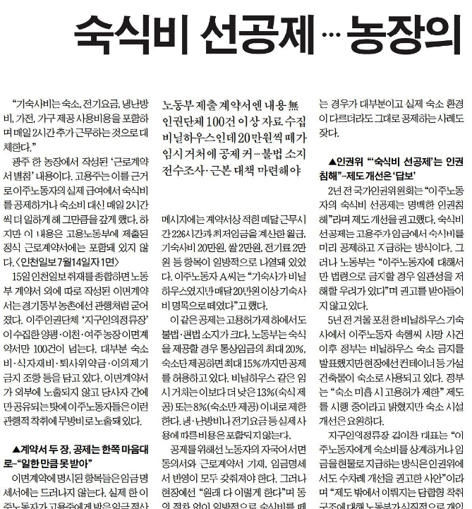 <ÀÎõÀϺ¸>´Â ¡°°æ±âÁö¿ª ³óÃÌ¿¡¼´Â ÀϺΠ°í¿ëÁÖµéÀÌ ÀÌÁֳ뵿ÀÚ¿Í °ø½Ä °è¾à°ú´Â º°µµ·Î ¡®À̸é°è¾à¡¯À» °üÇàó·³ ¿ä±¸Çϰí ÀÖ´Ù. ¼÷½Äºñ ¸í¸ñÀÇ °øÁ¦¿Í Àå½Ã°£ ³ëµ¿ÀÌ ºñ°ø½Ä ¹®¼³ª ±¸µÎ»óÀ¸·Î ÀÌ·ïÁö¸ç ÀÌ´Â ÀÓ±Ý¸í¼¼¼¿¡µµ ¹Ý¿µµÇÁö ¾Ê´Â´Ù. ±â¼÷»ç´Â ¿©ÀüÈ÷ ºñ´ÒÇϿ콺 °°Àº Àӽýü³ÀÎ °æ¿ì°¡ ¸¹´Ù. ±¹°¡ÀαÇÀ§¿øÈ¸´Â ¡®¼÷½Äºñ ¼± °øÁ¦¡¯¸¦ ÀαÇÄ§ÇØ·Î ±ÔÁ¤ÇßÁö¸¸ Á¦µµ °³¼±Àº ´äº¸ »óÅ´Ù.¡±¶ó¸ç ÃëÀç ÀÌÀ¯¸¦ ¹àÇû´Ù.