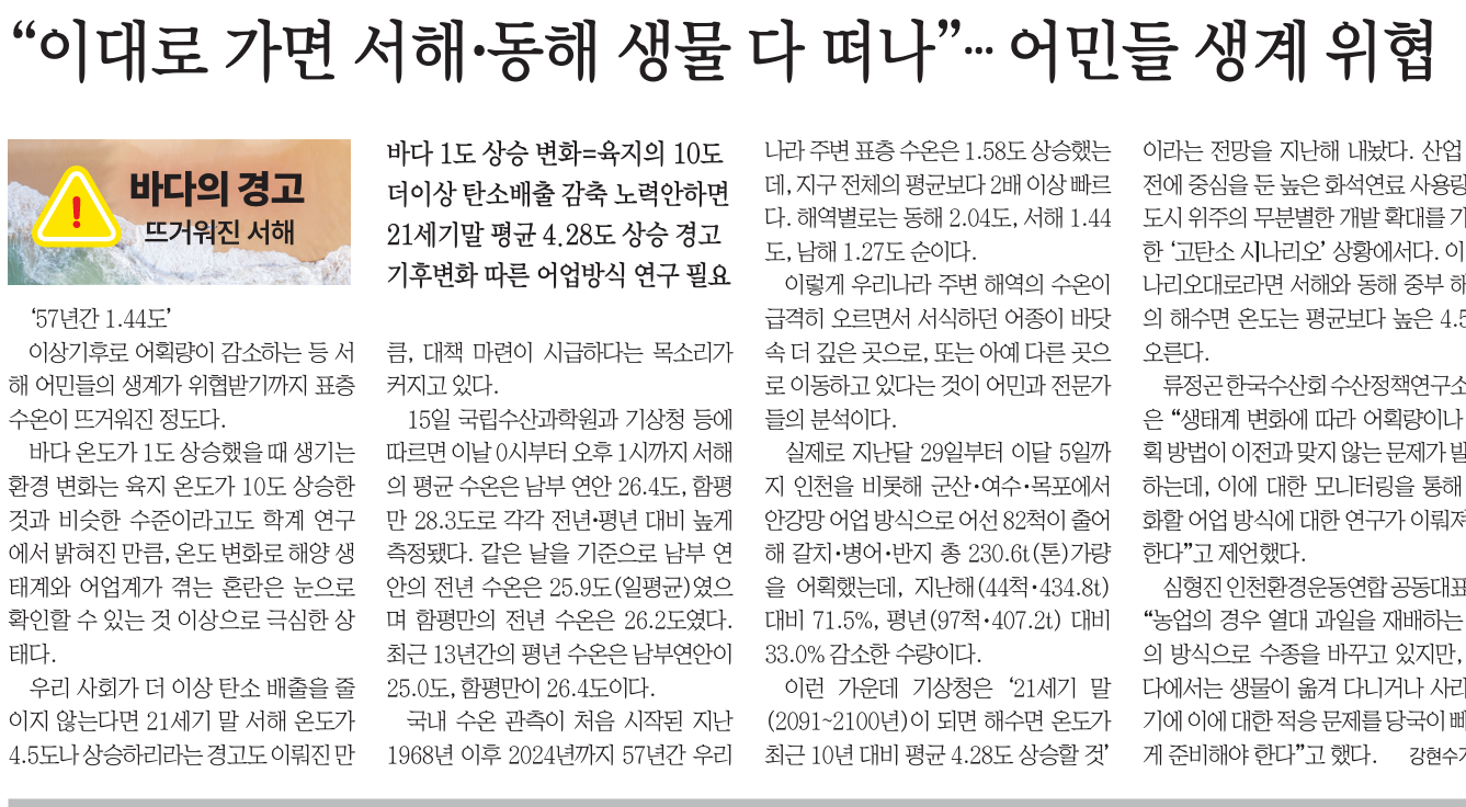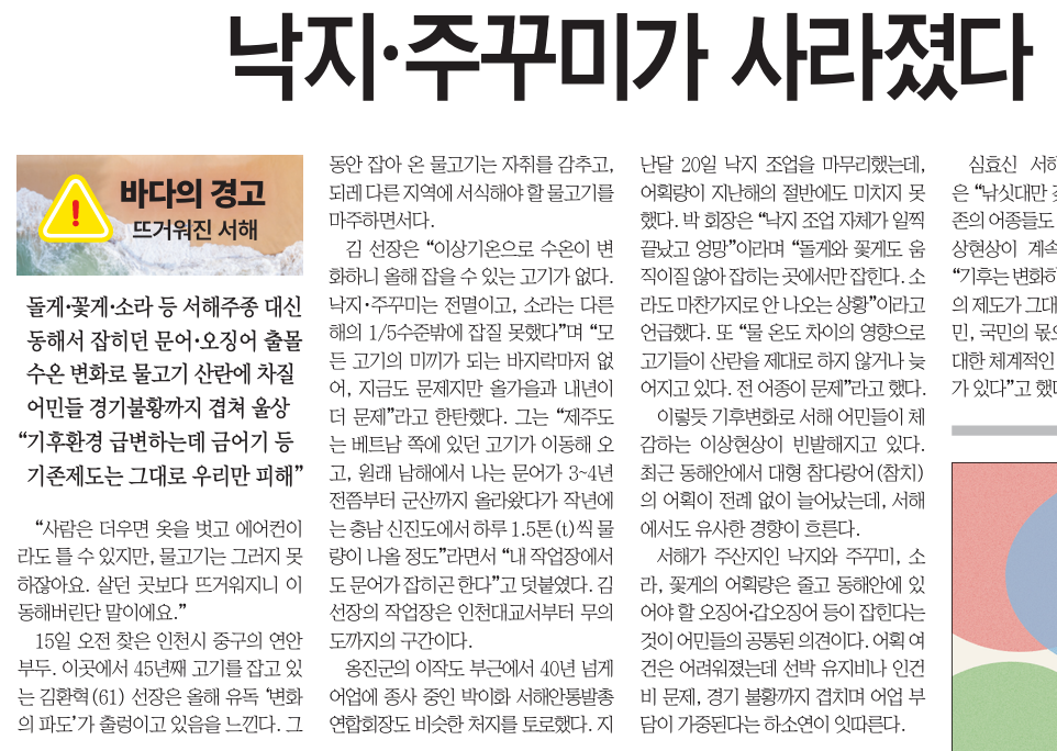 16ÀÏ 2¸é <ÀÌ´ë·Î °¡¸é ¼ÇØ‧µ¿ÇØ »ý¹° ´Ù ¶°³ª¡¦¾î¹Îµé »ý°è À§Çù> ±â»ç¿¡¼ ¡°¿ì¸®³ª¶ó ÁÖº¯ ÇØ¿ªÀÇ ¼ö¿ÂÀÌ ±Þ°ÝÈ÷ ¿À¸£¸é¼ ¼½ÄÇÏ´ø ¾îÁ¾ÀÌ ¹Ù´å¼Ó ´õ ±íÀº °÷À¸·Î, ¶Ç´Â ¾Æ¿¹ ´Ù¸¥ °÷À¸·Î À̵¿Çϰí ÀÖ´Ù´Â °ÍÀÌ ¾î¹Î°ú Àü¹®°¡µéÀÇ ºÐ¼®...¡±À̶ó¸é ¡°»ýÅÂ°è º¯È¿¡ µû¶ó ¾îȹ·®À̳ª ¾îȹ ¹æ¹ýÀÌ ÀÌÀü°ú ¸ÂÁö ¾Ê´Â ¹®Á¦°¡ ¹ß»ýÇϴµ¥, ÀÌ¿¡ ´ëÇÑ ¸ð´ÏÅ͸µÀ» ÅëÇØ º¯ÈÇÒ ¾÷ ¹æ½Ä¿¡ ´ëÇÑ ¿¬±¸°¡ ÀÌ·ïÁ®¾ß ÇÑ´Ù¡±´Â Àü¹®°¡ÀÇ Á¦¾ðÀ» º¸µµÇß´Ù. |