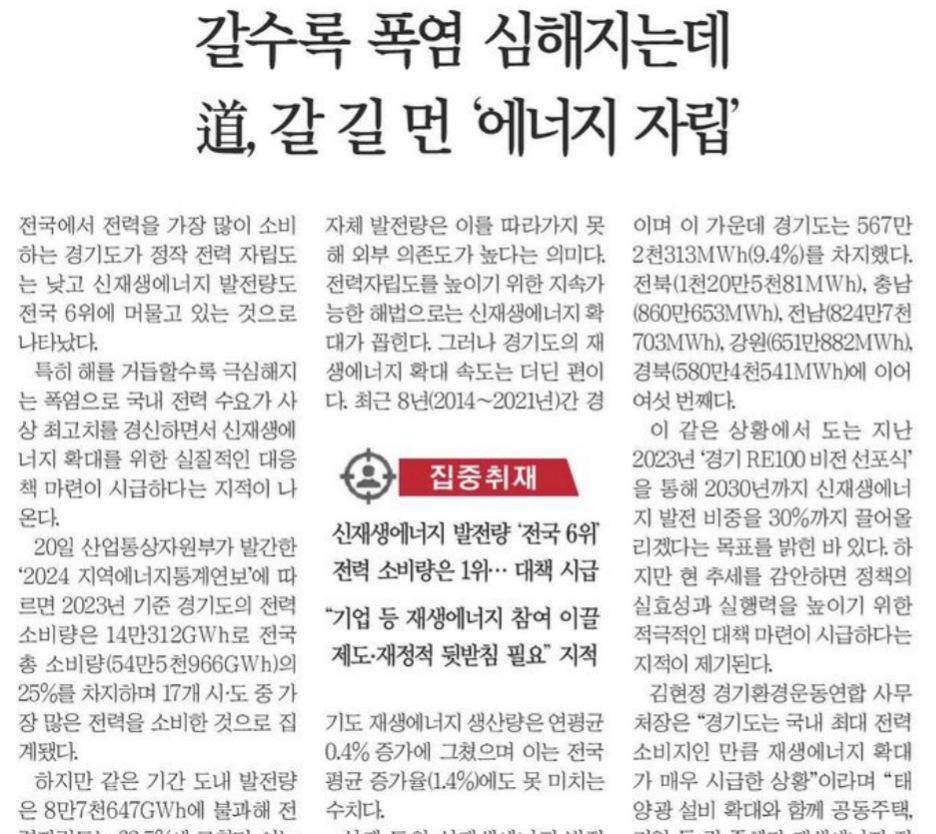 <°æ±âÀϺ¸>´Â 21ÀÏ 1¸é <ÁýÁßÃëÀç - °¥¼ö·Ï Æø¿° ½ÉÇØÁö´Âµ¥ µµ, °¥±æ ¸Õ ¡®¿¡³ÊÁö ÀÚ¸³¡¯> ±â»ç¿¡¼ ¡° 20ÀÏ »ê¾÷Åë»óÀÚ¿øºÎ°¡ ¹ß°£ÇÑ ¡®2024 Áö¿ª¿¡³ÊÁöÅë°è¿¬º¸¡¯¿¡ µû¸£¸é 2023³â ±âÁØ °æ±âµµÀÇ Àü·Â ¼Òºñ·®Àº 14¸¸312GWh·Î Àü±¹ ÃÑ ¼Òºñ·®(54¸¸5õ966GWh)ÀÇ 25%¸¦ Â÷ÁöÇϸç 17°³ ½Ã¡¤µµ Áß °¡Àå ¸¹Àº Àü·ÂÀ» ¼ÒºñÇÑ °ÍÀ¸·Î Áý°èµÆ´Ù. ÇÏÁö¸¸ °°Àº ±â°£ µµ³» ¹ßÀü·®Àº 8¸¸7õ647GWh¿¡ ºÒ°úÇØ Àü·ÂÀÚ¸³µµ´Â 62.5%¿¡ ±×ÃÆ´Ù. ÀÌ´Â 17°³ ½Ã¡¤µµ °¡¿îµ¥ 12À§·Î, Àü±¹ ÇÏÀ§±Ç ¼öÁØÀÌ´Ù.¡¦ÀÌ °°Àº »óȲ¿¡¼ µµ´Â Áö³ 2023³â ¡®°æ±â RE100 ºñÀü ¼±Æ÷½Ä¡¯À» ÅëÇØ 2030³â±îÁö ½ÅÀç»ý¿¡³ÊÁö ¹ßÀü ºñÁßÀ» 30%±îÁö ²ø¾î¿Ã¸®°Ú´Ù´Â ¸ñÇ¥¸¦ ¹àÈù ¹Ù ÀÖ´Ù. ÇÏÁö¸¸ Çö Ãß¼¼¸¦ °¨¾ÈÇϸé Á¤Ã¥ÀÇ ½ÇÈ¿¼º°ú ½ÇÇà·ÂÀ» ³ôÀ̱â À§ÇÑ Àû±ØÀûÀÎ ´ëÃ¥ ¸¶·ÃÀÌ ½Ã±ÞÇÏ´Ù´Â ÁöÀûÀÌ Á¦±âµÈ´Ù.¡± |
