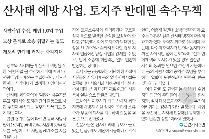 <°æÀÎÀϺ¸>´Â 22ÀÏ 1¸é <»ê»çÅ ¿¹¹æ »ç¾÷, ÅäÁöÁÖ ¹Ý´ë ¶© ¼Ó¼ö¹«Ã¥> ±â»ç¿¡¼ ¡°Á¤ºÎ¿Í ÁöÀÚüµéÀÌ »ê»çÅ ¿¹¹æÀ» À§ÇÑ ¡®»ç¹æ»ç¾÷¡¯À» ÃßÁøÇϱâ À§ÇØ ¸Å³â 100¾ï¿øÀÌ ³Ñ´Â ¿¹»êÀ» ÅõÀÔÇÏÁö¸¸, Á¦µµÀû ÇѰè·Î »ç°¢Áö´ë°¡ ¹ß»ýÇϰí ÀÖ´Ù´Â ÁöÀûÀÌ´Ù. »ê»çÅ Ãë¾àÁö¿ª¿¡ ¹ÐÁýÇÑ »çÀ¯Áö¸¦ µÎ°í ÁöÀÚü¿Í ÅäÁöÁÖ °£ÀÇ °¥µîÀ¸·Î »ç¾÷ ÃßÁøÀÌ ¹«»êµÇ´Â °æ¿ì°¡ ¹Ýº¹µÇ°í Àֱ⠶§¹®ÀÌ´Ù.¡¦ÇöÀç »ç¹æ»ç¾÷¹ýÀº ÁöÀÚü°¡ »ç¾÷ ÃßÁø¿¡ ÅäÁö¼ÒÀ¯ÀÚ¿Í ÇùÀÇÇϰųª ±¸Á¶¹° ¼³Ä¡ µîÀ¸·Î ¹ß»ýÇÑ ¼Õ½ÇÀ» º¸»óÇØ¾ß ÇÑ´Ù°í ±ÔÁ¤ÇÑ´Ù. ÀÌ¿¡ ÅäÁöÁÖ°¡ ¸·´ëÇÑ º¸»óÀ» ¿ä±¸Çϰųª ³¡±îÁö ¹Ý´ëÇÒ °æ¿ì, ÁöÀÚü ÀÔÀå¿¡¼± ´çÀå »ç¾÷À» °Á¦ÇÒ ¼ö ¾ø°í, ¹ýÀû ¼Ò¼Û¿¡ ÈÖ¸»¸®´Â Àϵµ ºó¹øÈ÷ ¹ß»ýÇÏ´Â »óÅ´Ù.¡±¶ó°í »ê»çÅ ¿¹¹æ ÀýÂ÷ÀÇ ¹®Á¦Àû Çö½ÇÀ» º¸µµÇß´Ù. |