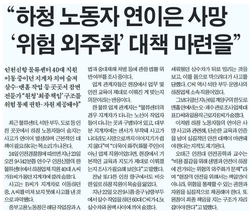 <ÀÎõÀϺ¸>´Â 25ÀÏ 7¸é <ÇÏû ³ëµ¿ÀÚ ¿¬ÀÌÀº »ç¸Á À§Çè¿ÜÁÖÈ ´ëÃ¥ ¸¶·ÃÀ»> ±â»ç¿¡¼ ¡°24ÀÏ ÀÎõ½ÅÇ× ¹°·ù¼¾ÅÍ 40´ë Á÷¿ø À̵¿ ÁßÀÌ´ø Áö°ÔÂ÷ Ä¡¿© ¼ûÁ³°í Àü³¯ ¶Ç´Ù¸¥ ÀÎõ Ç×±¸¿¡¼µµ ºñ½ÁÇÑ ÀÏ·Î ÇÏû Á÷¿øÀÌ ¸ñ¼ûÀ» ÀÒ¾ú´Ù. Áö³ 22ÀÏ ¿ÀÀü 9½ÃÂë Áß±¸ ³²Ç׺εο¡¼ »ì¼ö ÀÛ¾÷À» ÇÏ´ø 60´ë C¾¾°¡ 4.5t »ì¼öÂ÷¿Í ¿Ëº® »çÀÌ¿¡ ³¢¾î ¼ûÁ³´Ù.¡±¶ó°í »ì¼ö‧¸ÇȦ ÀÛ¾÷ µî °÷°÷¼ ÇÏû ³ëµ¿ÀÚµéÀÇ ¿¬ÀÌÀº »ç¸Á»ç°í¸¦ º¸µµÇÏ°í ¡°ºñ¿ë Àý°¨À» À§ÇØ »ý¸í°ú ¾ÈÀüÀÌ ÇÏû¿¡ Àü°¡µÇ´Â À§ÇèÀÇ ¿ÜÁÖȰ¡ ¹®Á¦¡±¶ó¸ç ¡°ÇöÀåÀÇ ¾ÈÀüÀ» À§Çؼ´Â Ã¥ÀÓ¸¸ÀÌ ¾Æ´Ï¶ó, À§ÇèÀ» ÅëÁ¦ÇÒ ¼ö ÀÖ´Â ±ÇÇѰú ÀÚ¿øÀ» ½ÇÁúÀûÀ¸·Î Á¦°øÇØ¾ß ÇÑ´Ù. ¶Ç ¿øÃ»ÀÌ ÃÖÁ¾ Ã¥ÀÓÀ» Áö´Â ±¸Á¶°¡ ÀÚ¸® Àâ¾Æ¾ß ÇÑ´Ù¡±°í ¸»Çß´Ù.¡±¶ó°í ¿Àű٠ÀÎõ´ë ¾ÈÀü°øÇаú ±³¼öÀÇ ´ëÃ¥À» º¸µµÇß´Ù. |