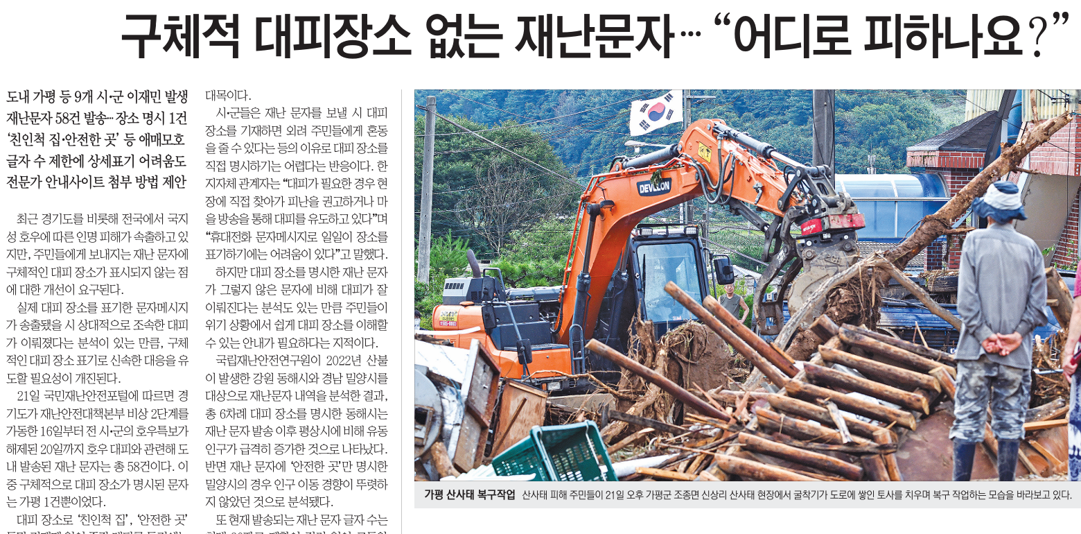 <ÁߺÎÀϺ¸>´Â 22ÀÏ 8¸é <±¸Ã¼Àû ´ëÇÇ Àå¼Ò ¾ø´Â Àç³¹®ÀÚ¡¦¡°¾îµð·Î ÇÇÇϳª¿ä?¡±> ±â»ç¿¡¼ ¡°ÃÖ±Ù °æ±âµµ¸¦ ºñ·ÔÇØ Àü±¹¿¡¼ ±¹Áö¼º È£¿ì¿¡ µû¸¥ Àθí ÇÇÇØ°¡ ¼ÓÃâÇϰí ÀÖÁö¸¸, Áֹε鿡°Ô º¸³»Áö´Â Àç³ ¹®ÀÚ¿¡ ±¸Ã¼ÀûÀÎ ´ëÇÇ Àå¼Ò°¡ Ç¥½ÃµÇÁö ¾Ê´Â Á¡¿¡ ´ëÇÑ °³¼±ÀÌ ¿ä±¸µÈ´Ù.¡¦°æ±âµµ¿¡ µû¸£¸é Áö³ 16ÀϺÎÅÍ ¿³»õ°£ È£¿ì °ü·Ã ÀÌÀç¹ÎÀÌ ¹ß»ýÇÑ ½Ã¡¤±ºÀº 9°÷À̾úÁö¸¸, Áֹε鿡°Ô ±¸Ã¼ÀûÀÎ ´ëÇÇ Àå¼Ò°¡ ¾È³»µÈ Àç³ ¹®ÀÚ´Â °ÅÀÇ ¾ø¾ú´Ù.¡¦ÇöÀç ¹ß¼ÛµÇ´Â Àç³ ¹®ÀÚ ±ÛÀÚ ¼ö´Â ÃÖ´ë 90ÀÚ·Î Á¦ÇÑÀÌ °É·Á ÀÖ¾î ±×µ¿¾È ´ëÇÇ Àå¼Ò µî »ó¼¼ÇÑ ³»¿ëÀ» ´ã±â ¾î·Æ´Ù´Â ÁöÀûµµ Á¦±âµÈ´Ù.
