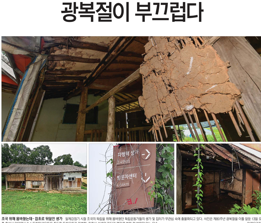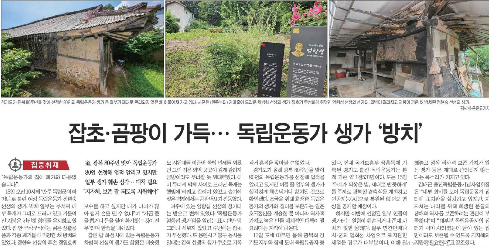 <°æ±âÀϺ¸>´Â ¡°°æ±âµµ°¡ ¿ÃÇØ ±¤º¹ 80ÁÖ³âÀ» ¸Â¾Æ 80ÀÎÀÇ µ¶¸³¿îµ¿°¡¸¦ ¼±Á¤ÇØ ¾÷ÀûÀ» ¾Ë¸®°í ÀÖÁö¸¸, À̵é Áß ÀϺÎÀÇ »ý°¡°¡ ½É°¢ÇÏ°Ô ÈѼյǰųª ¹æÄ¡µÈ °ÍÀ¸·Î È®ÀεƴÙ. Á¶±¹À» À§ÇØ Èñ»ýÇÑ µ¶¸³¿îµ¿°¡ÀÇ »ý°¡¿Í ÁýÅ͸¦ º¸Á¸ÇÏ´Â ÀÏÀº È£±¹Á¤½ÅÀ» °è½ÂÇÒ »Ó ¾Æ´Ï¶ó ¿ª»çÀû °¡Ä¡µµ ³ôÀº ¸¸Å ü°èÀûÀÎ ´ëÃ¥ÀÌ Çʿ䡱ÇÏ´Ù°í ÁöÀûÇϰí 14ÀÏ 1¸é <ÁýÁßÃëÀç-ÀâÃÊ¡¤°õÆÎÀÌ °¡µæ¡¦µ¶¸³¿îµ¿°¡ »ý°¡ ¹æÄ¡> ±â»ç¿¡¼ ¡°¡®¸¸ÁÖ µ¶¸³±ºÀÇ ¾î¸Ó´Ï¡¯·Î ºÒ¸° ¿©¼º µ¶¸³¿îµ¿°¡ Á¤Çö¼÷ ¼±»ýÀÇ »ý°¡, ȼº½Ã¿¡ ÀÖ´Â µ¶¸³¿îµ¿°¡ Â÷º´Çõ ¼±»ýÀÇ »ý°¡, ¿©ÁÖ¿¡ ÀÖ´Â ¾öÇ×¼· ¼±»ýÀÇ »ý°¡ÅÍ¡±¸¦ º¸µµÇÏ¸ç ¡°º®Ã¼ ÀϺδ ºÎ¼Á® ³»ºÎ ¸ñÀç°¡ ±×´ë·Î µå·¯³ª ÀÖ°í, ±â¿ï¾îÁø ÁöºØÀº °£½ÅÈ÷ ÇüŸ¦ À¯Áö, ¹«³ÊÁ® º®Ã¼ »çÀÌ·Î µå·¯³ ¸ñÀç´Â ÇÞºû¿¡ ¹Ù·¡°í °¥¶óÁ® ÀÖ¾ú°í, ½À±â¿¡ Á¥Àº º®Áö¿¡¼´Â °õÆÎ³¿»õ°¡ Áøµ¿, »ý°¡°¡ ¹çÀ¸·Î º¯ÇØ ÀÖ¾ú´Ù.¡±¶ó°í °ü¸®µÇÁö ¾ÊÀº »ý°¡ÅÍÀÇ Çö½ÇÀ» º¸µµÇß´Ù.