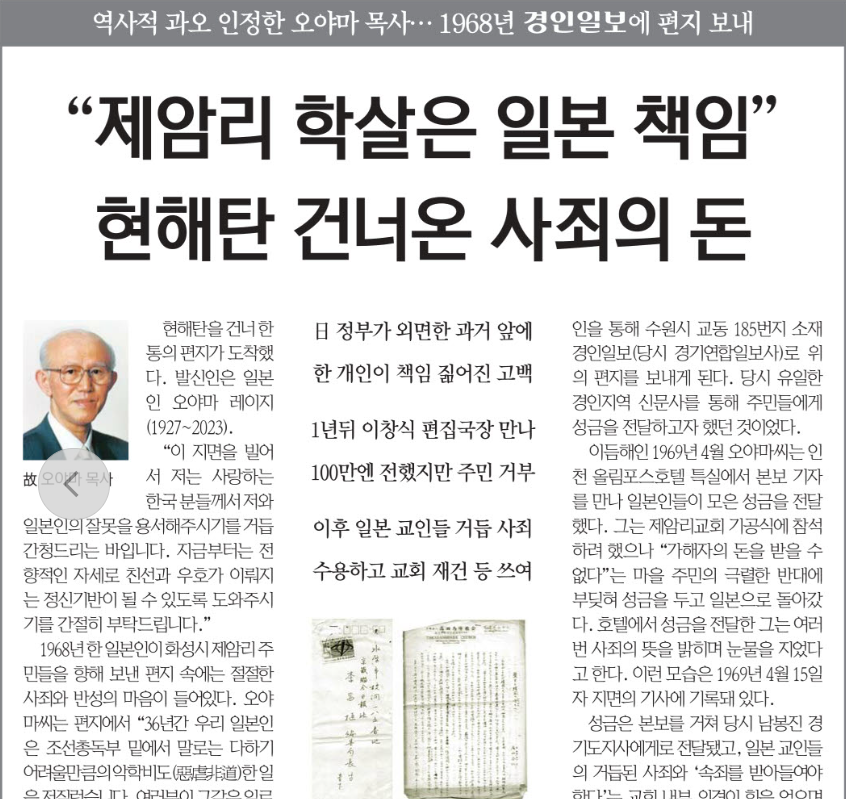 <°æÀÎÀϺ¸>´Â ÀÏÁ¦ÀÇ 3.1¸¸¼¼ ¿îµ¿ Çлì·Î À¯¸íÇÑ È¼º Á¦¾Ï¸® ±³È¸¿¡ ÀϺ»ÀÇ ¸ñ»ç°¡ ¡®»ç°ú ÆíÁö¡¯¿Í ¼º±ÝÀ» Àü´ÞÇÑ °úÁ¤À» º¸µµÇß´Ù. 14ÀÏ 1¸é <¿ª»çÀû °ú¿À ÀÎÁ¤ÇÑ ¿À¾ß¸¶ ¸ñ»ç¡¦1968³â °æÀÎÀϺ¸¿¡ ÆíÁö º¸³»> ±â»ç¿¡¼ ¡°¡®Á¦¾Ï¸® Çл쿡 ¹Ý¼º¡¯ÇÑ ¿À¾ß¸¶ ÀϺ» ¸ñ»ç°¡ Á¦¾Ï¸® Áֹε鿡°Ô ÇлìÀ» »ç°úÇÏ´Â ÆíÁö¿Í °æÀÎÀϺ¸¸¦ ÅëÇØ ¼º±Ý 100¸¸ ¿£(´ç½Ã ÇÑÈ 1õ¸¸¿ø)À» ÀüÇÏ·Á ÇßÀ¸³ª ÁֹεéÀÌ °ÅÀý¡¦ 1969³â Áö¸é¿¡ ³²Àº ±â·ÏÀ» ÅëÇØ ´ç½Ã ³²ºÀÁø °æ±âµµÁö»ç¿¡°Ô Àü´ÞÇÑ ¼º±ÝÀÌ Àý¹ÝÀº ±³È¸ Àç°Ç¿¡ ¾²¿´°í, Àý¹ÝÀº Á¦¾Ï¸® ÁÖ¹Îȸ°ü °Ç¸³¿¡ ¾²¿´´Ù.¡±¶ó°í º¸µµÇß´Ù.