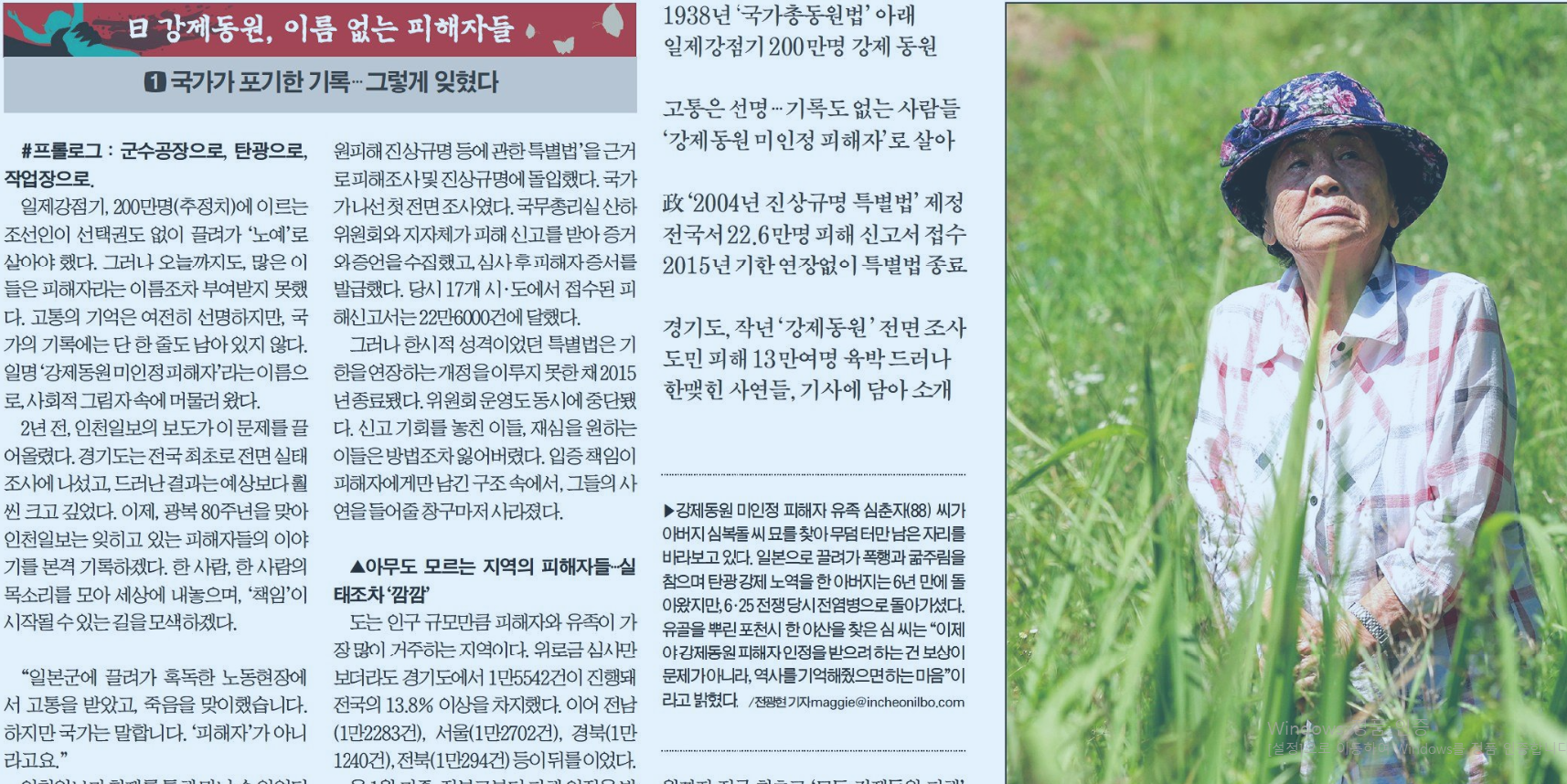 <ÀÎõÀϺ¸>´Â ¡°ÀÏÁ¦°Á¡±â, 200¸¸ ¸í(ÃßÁ¤Ä¡)¿¡ À̸£´Â Á¶¼±ÀÎÀÌ ¼±Åñǵµ ¾øÀÌ ²ø·Á°¡ '³ë¿¹'·Î »ì¾Æ¾ß Çß´Ù. ±×·¯³ª ¿À´Ã±îÁöµµ, ¸¹Àº À̵éÀº ÇÇÇØÀÚ¶ó´Â À̸§Á¶Â÷ ºÎ¿©¹ÞÁö ¸øÇß´Ù. °íÅëÀÇ ±â¾ïÀº ¿©ÀüÈ÷ ¼±¸íÇÏÁö¸¸, ±¹°¡ÀÇ ±â·Ï¿¡´Â ´Ü ÇÑ ÁÙµµ ³²¾Æ ÀÖÁö ¾Ê´Ù. Àϸí '°Á¦µ¿¿ø ¹ÌÀÎÁ¤ ÇÇÇØÀÚ'¶ó´Â À̸§À¸·Î, »çȸÀû ±×¸²ÀÚ ¼Ó¿¡ ¸Ó¹°·¯ ¿Ô´Ù.¡±¶ó¸ç <ìí °Á¦µ¿¿ø, À̸§ ¾ø´Â ÇÇÇØÀÚµé> Á¦¸ñÀÇ ±âȹ±â»ç¸¦ º¸µµÇß´Ù.
