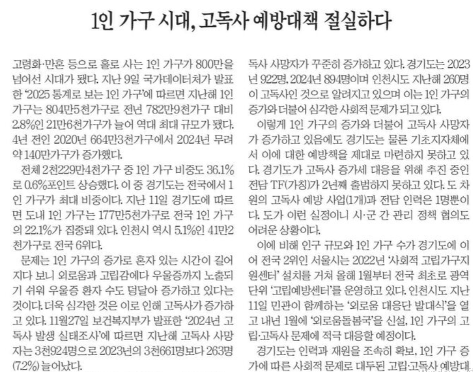 <°æ±âÀϺ¸>´Â 15ÀÏ 19¸é <1ÀÎ °¡±¸ ½Ã´ë, °íµ¶»ç ¿¹¹æ´ëÃ¥ Àý½ÇÇÏ´Ù> »ç¼³¿¡¼ ¡°11¿ù27ÀÏ º¸°Çº¹ÁöºÎ°¡ ¹ßÇ¥ÇÑ ¡®2024³â °íµ¶»ç ¹ß»ý ½ÇÅÂÁ¶»ç¡¯¿¡ µû¸£¸é Áö³ÇØ °íµ¶»ç »ç¸ÁÀÚ´Â 3õ924¸íÀ¸·Î 2023³âÀÇ 3õ661¸íº¸´Ù 263¸í(7.2%) ´Ã¾î³µ´Ù.¡¦ÀÌ·¸°Ô 1ÀÎ °¡±¸ÀÇ Áõ°¡¿Í ´õºÒ¾î °íµ¶»ç »ç¸ÁÀÚ°¡ Áõ°¡Çϰí ÀÖÀ½¿¡µµ °æ±âµµ´Â ¹°·Ð ±âÃÊÁöÀÚü¿¡¼ ÀÌ¿¡ ´ëÇÑ ¿¹¹æÃ¥À» Á¦´ë·Î ¸¶·ÃÇÏÁö ¸øÇϰí ÀÖ´Ù. °æ±âµµ°¡ °íµ¶»ç Áõ°¡¼¼ ´ëÀÀÀ» À§ÇØ ÃßÁø ÁßÀÎ Àü´ã TF(°¡Äª)°¡ 2³â° Ãâ¹üÇÏÁö ¸øÇϰí ÀÖ´Ù. µµ Â÷¿øÀÇ °íµ¶»ç ¿¹¹æ »ç¾÷(1°³)°ú Àü´ã ÀηÂÀº 1¸í»ÓÀÌ´Ù. µµ°¡ ÀÌ·± ½ÇÁ¤ÀÌ´Ï ½Ã¡¤±º °£ °ü¸® Á¤Ã¥ ÇùÀǵµ ¾î·Á¿î »óȲÀÌ´Ù.¡±¶ó°í °æ±âµµ°¡ ¼¿ï½Ã¿Í ÀÎõ½Ã°¡ ÃßÁøÇϰí ÀÖ´Â °íµ¶»ç ¿¹¹æ ´ëÃ¥À» ÁøÇàÇÒ °ÍÀ» Ã˱¸Çß´Ù. |
