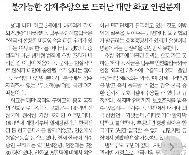 <°æÀÎÀϺ¸> 16ÀÏ 19¸é <ºÒ°¡´ÉÇÑ °Á¦Ãß¹æÀ¸·Î µå·¯³ ´ë¸¸ ȱ³ Àαǹ®Á¦> »ç¼³¿¡¼ ¡°60´ë ´ë¸¸ ȱ³ 3¼¼¿¡°Ô ÀÌ·ÊÀûÀÎ °Á¦ Åð°Å¸í·ÉÀÌ ³»·ÁÁ³´Ù. ¹ý¹«ºÎ ¾È»êÃâÀÔ±¹Àº ¡°Çѱ¹ÀÇ ¼±·®ÇÑ ¹Ìdz¾ç¼ÓÀ» ÇØÄ¥ ¿ì·Á°¡ ÀÖ´Ù¡±´Â ÀÌÀ¯·Î Çѱ¹À» ¶°³ª¶ó°í ¸íÇß´Ù. Áß¹üÁ˰¡ ¾Æ´Ñ »ý°èÇü ¹üÁË¿¡ Ãß¹æ Á¶Ä¡°¡ ³»·ÁÁø °Ç À̹øÀÌ Ã³À½ÀÌ´Ù. ¹®Á¦´Â Çö½ÇÀûÀ¸·Î ÇѾ¾°¡ ´ë¸¸¿¡ ¼ÛȯµÉ ¼ö°¡ ¾ø´Ù´Â Á¡ÀÌ´Ù. ±¹Àû¸¸ ´ë¸¸ÀÏ »ÓÀÌÁö, º»±¹¿¡¼ Á¤ÁÖ ÀÚ°ÝÁ¶Â÷ ¾ø´Â ¡®¹«È£Àû(ÙíûÂîß) ±¹¹Î¡¯À̱⠶§¹®ÀÌ´Ù.¡¦ÀÎõ¿¡¼ ž ¿Ü±¹ Çѹø ¾È ³ª°¡ºÃ´Âµ¥, ¾îµð·Î °¡¾ß ÇÒÁö ¸·¸·ÇÏ°í ºÒ¾ÈÇÏ´Ù. Ãß¹æµÇ¸é Æò»ý »ì¾Æ¿Â Çѱ¹¿¡µµ 5³â°£ ÀÔ±¹ÇÒ ¼ö ¾ø´Ù. ³¹Îó·³ °øÇ׿¡¼ »ýÈ°ÇØ¾ß ÇÒ °¡´É¼ºµµ ÀÖ´Ù.¡¦¹ý¹«ºÎ´Â ÇѾ¾¿¡°Ô ³»·ÁÁø óºÐÀÌ Á¤´çÇÑÁö °ËÅä¿¡ ³ª¼¹´Ù. Á¤ºÎ´Â ±¸È±³ÀÇ ºÒ¾ÈÁ¤¼ºÀ» ÇØ¼ÒÇÒ Á¦µµÀû ¹æ¾ÈÀ» ¿Ü±³Àû, ÀεµÀû Â÷¿ø¿¡¼ ¸ð»öÇØ¾ß ÇÑ´Ù.¡±¶ó°í »ý°èÇü ¹üÁË·Î Ãß¹æ´çÇÑ È±³ÀÇ °Á¦Ãß¹æ ¹®Á¦¸¦ ÁöÀûÇÏ°í ´ëÃ¥À» Ã˱¸Çß´Ù. |