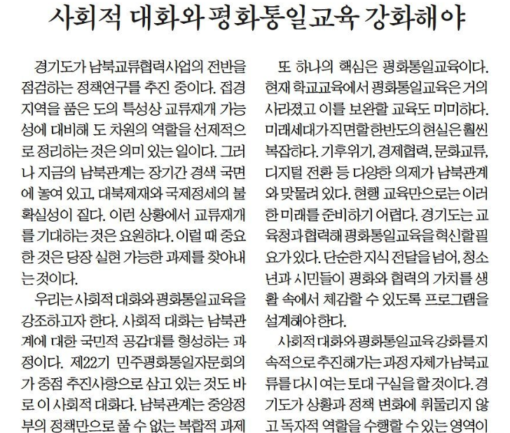 <ÀÎõÀϺ¸>´Â 18ÀÏ 19¸é <»çȸÀû ´ëÈ¿Í ÆòÈÅëÀϱ³À° °ÈÇØ¾ß> »ç¼³¿¡¼ ¡°°æ±âµµ°¡ ³²ºÏ±³·ùÇù·Â»ç¾÷ÀÇ Àü¹ÝÀ» Á¡°ËÇÏ´Â Á¤Ã¥¿¬±¸¸¦ ÃßÁø ÁßÀÌ´Ù. Á¢°æÁö¿ªÀ» ǰÀº µµÀÇ Æ¯¼º»ó ±³·ùÀç°³ °¡´É¼º¿¡ ´ëºñÇØ µµ Â÷¿øÀÇ ¿ªÇÒÀ» ¼±Á¦ÀûÀ¸·Î Á¤¸®ÇÏ´Â °ÍÀº ÀÇ¹Ì ÀÖ´Â ÀÏÀÌ´Ù. ±×·¯³ª Áö±ÝÀÇ ³²ºÏ°ü°è´Â Àå±â°£ °æ»ö ±¹¸é¿¡ ³õ¿© ÀÖ°í, ´ëºÏÁ¦Àç¿Í ±¹Á¦Á¤¼¼ÀÇ ºÒÈ®½Ç¼ºÀÌ Â£´Ù. ÀÌ·± »óȲ¿¡¼ ±³·ùÀç°³¸¦ ±â´ëÇÏ´Â °ÍÀº ¿ä¿øÇÏ´Ù. ÀÌ·² ¶§ Áß¿äÇÑ °ÍÀº ´çÀå ½ÇÇö °¡´ÉÇÑ °úÁ¦¸¦ ã¾Æ³»´Â °ÍÀÌ´Ù. ¿ì¸®´Â »çȸÀû ´ëÈ¿Í ÆòÈÅëÀϱ³À°À» °Á¶ÇϰíÀÚ ÇÑ´Ù.¡¦»çȸÀû ´ëÈ¿Í ÆòÈÅëÀϱ³À° °È¸¦ Áö¼ÓÀûÀ¸·Î ÃßÁøÇذ¡´Â °úÁ¤ ÀÚü°¡ ³²ºÏ±³·ù¸¦ ´Ù½Ã ¿©´Â Åä´ë ±¸½ÇÀ» ÇÒ °ÍÀÌ´Ù. µµ¹ÎµéÀÇ ÀνÄÀÌ º¯ÈÇÏ°í ÆòÈÀÇ °¡Ä¡°¡ »ýȰ ¼Ó¿¡ »Ñ¸®³»¸± ¶§, ³²ºÏ±³·ù´Â ´Ü¼øÇÑ À̺¥Æ®°¡ ¾Æ´Ï¶ó Áö¼Ó°¡´ÉÇÑ Çù·ÂÀ¸·Î ÀÚ¸® ÀâÀ» ¼ö ÀÖ´Ù. °æ±âµµ´Â ¸ÕÀú µµ¹Î°ú ÇÔ²² Æòȸ¦ À̾߱âÇÏ°í ¹è¿ì´Â °úÁ¤¿¡ ÈûÀ» ½ñ¾ÆÁֱ⸦ ¹Ù¶õ´Ù.¡±¶ó°í Á¢°æÁö¿ªÀ̶ó´Â Ư¼ö¼ºÀ» °¡Áø °æ±âµµ°¡ »çȸÀû ´ëÈ¿Í ÆòÈÅëÀÏ ±³À°ÀÇ °È¸¦ Ã˱¸Çß´Ù. |
