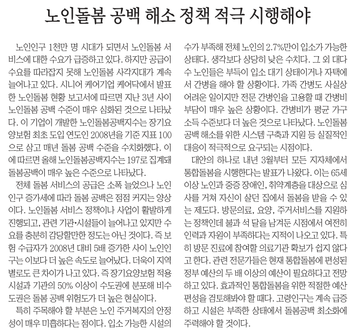 <ÁߺÎÀϺ¸>´Â 19ÀÏ 19¸é <³ëÀε¹º½ °ø¹é ÇØ¼Ò Á¤Ã¥ Àû±Ø ½ÃÇàÇØ¾ß> »ç¼³¿¡¼ ¡°³ëÀÎÀα¸ 1õ¸¸ ¸í ½Ã´ë°¡ µÇ¸é¼ ³ëÀε¹º½ ¼ºñ½º¿¡ ´ëÇÑ ¼ö¿ä°¡ ±ÞÁõÇϰí ÀÖ´Ù. ÇÏÁö¸¸ °ø±ÞÀÌ ¼ö¿ä¸¦ µû¶óÀâÁö ¸øÇØ ³ëÀε¹º½ »ç°¢Áö´ë°¡ °è¼Ó ´Ã¾î³ª°í ÀÖ´Ù. ½Ã´Ï¾î Äɾî±â¾÷ Äɾî´Ú¿¡¼ ¹ßÇ¥ÇÑ ³ëÀε¹º½ ÇöȲ º¸°í¼¿¡ µû¸£¸é Áö³ 3³â »çÀÌ ³ëÀε¹º½ °ø¹é ¼öÁØÀÌ ¸Å¿ì ½ÉÈµÈ °ÍÀ¸·Î ³ªÅ¸³µ´Ù.¡¦Æ¯È÷ ÁÖ¸ñÇØ¾ß ÇÒ ºÎºÐÀº ³ëÀÎ Áְź¹ÁöÀÇ ¾ÈÁ¤¼ºÀÌ ¸Å¿ì ¹ÌÈíÇÏ´Ù´Â Á¡ÀÌ´Ù. ÀÔ¼Ò °¡´ÉÇÑ ½Ã¼³ÀÇ ¼ö°¡ ºÎÁ·ÇØ Àüü ³ëÀÎÀÇ 2.7%¸¸ÀÌ ÀÔ¼Ò°¡ °¡´ÉÇÑ »óÅ´Ù. »ý°¢º¸´Ù »ó´çÈ÷ ³·Àº ¼öÄ¡´Ù. ±× ¿Ü ´ë´Ù¼ö ³ëÀεéÀº ºÎµæÀÌ ÀÔ¼Ò ´ë±â »óÅÂÀ̰ųª ÀÚÅÿ¡¼ °£º´À» ÇØ¾ß ÇÒ »óȲÀÌ´Ù.¡¦°ü·Ã Àü¹®°¡µéÀº ÇöÀç ÅëÇÕµ¹º½¿¡ Æí¼ºµÈ Á¤ºÎ ¿¹»êÀÇ µÎ ¹è ÀÌ»óÀÇ ¿¹»êÀÌ ÇÊ¿äÇÏ´Ù°í Àü¸ÁÇϰí ÀÖ´Ù. È¿°úÀûÀÎ ÅëÇÕµ¹º½À» À§ÇÑ ÀûÀýÇÑ ¿¹»ê Æí¼ºÀ» °ËÅäÇØºÁ¾ß ÇÒ ¶§´Ù. °í·ÉÀα¸´Â °è¼Ó ±ÞÁõÇÏ°í ½Ã¼³Àº ºÎÁ·ÇÑ »óÅ¿¡¼ µ¹º½°ø¹é ÃÖ¼ÒÈ¿¡ ÁÖ·ÂÇØ¾ß ÇÒ °ÍÀÌ´Ù.¡±¶ó°í ³ëÀÎÀÇ ÅëÇÕ µ¹º½À» À§ÇÑ ¿¹»ê Æí¼ºÀÇ Çʿ伺À» ÁÖÀåÇß´Ù. |