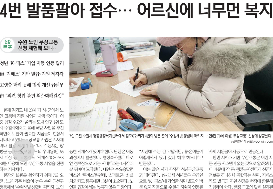 <°æÀÎÀϺ¸>´Â ÇöÀ帣Æ÷ ±â»ç·Î û³â ¡®K-ÆÐ½º¡¯ °¡ÀÔ ÀÚµ¿ ¿¬µ¿ ´Þ¸®, ³ëÀÎÀ» À§ÇÑ Ô³ ¡®ÁöÆÐ½º¡¯ ±â¹Ý ¹ß±Þ¡¤Áö¿ø Á¦°¢°¢À¸·Î ³ëÀεéÀÌ ¹«»ó±³Åë ½ÅûÀÇ ¹®Á¦¸¦ 4¹ø ¹ßǰ ÆÈ¾Æ Á¢¼ö¡¦ ¾î¸£½Å¿¡ ³Ê¹« ¸Õ º¹Áö·Î °í·ÉÃþ ¹è·Á ¸øÇØ ÇàÁ¤ °³¼±ÀÌ ÇÊ¿äÇÏ´Ù°í º¸µµÇß´Ù.